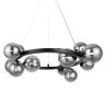 Металлическая арматура в четырех цветах: матовый черный, хром, золото, латунь. Плафоны — выдувное стекло. Цвета — дымчатый, янтарный, коньячный. Дизайн с имитацией молекулярной структуры. Высота подвесных светильников регулируется тросом. Лампа с цоколем G9.