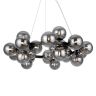 Металлическая арматура в четырех цветах: матовый черный, хром, золото, латунь. Плафоны — выдувное стекло. Цвета — дымчатый, янтарный, коньячный. Дизайн с имитацией молекулярной структуры. Высота подвесных светильников регулируется тросом. Лампа с цоколем G9.